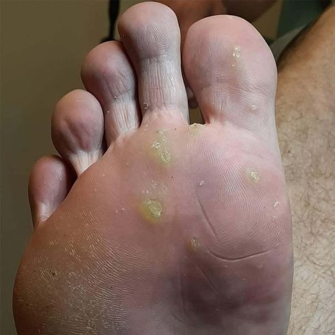 ▶ Ладонно-подошвенные бородавки образуются на стопах и ладонях. Они имеют большие размеры (до 4 сантиметров в диаметре) и жесткую структуру, напоминающую мозоли. Эти бородавки обычно единичны, глубоко укоренены и вызывают значительную боль.